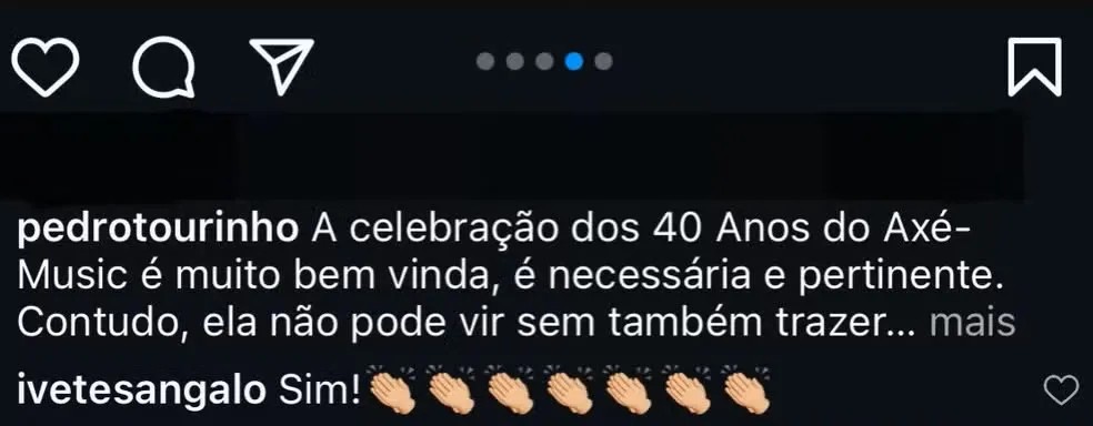 Pouco depois, Ivete Sangalo surgiu nos comentários da publicação, defendendo o pensamento, com direito a palmas.