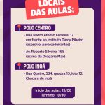 As aulas acontecerão às sextas-feiras, com carga horária de 40 horas, nos polos Centro e Inoã. A Informática Básica será oferecida nos dois polos, enquanto o curso de Educação Financeira será realizado apenas no Centro. A formação é presencial e garante fácil acesso e acompanhamento pedagógico.